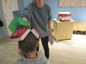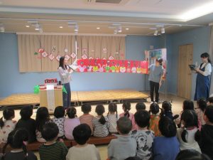 干支の話を聞いたり、コマや福笑い等のお正月遊びを見て楽しみました。